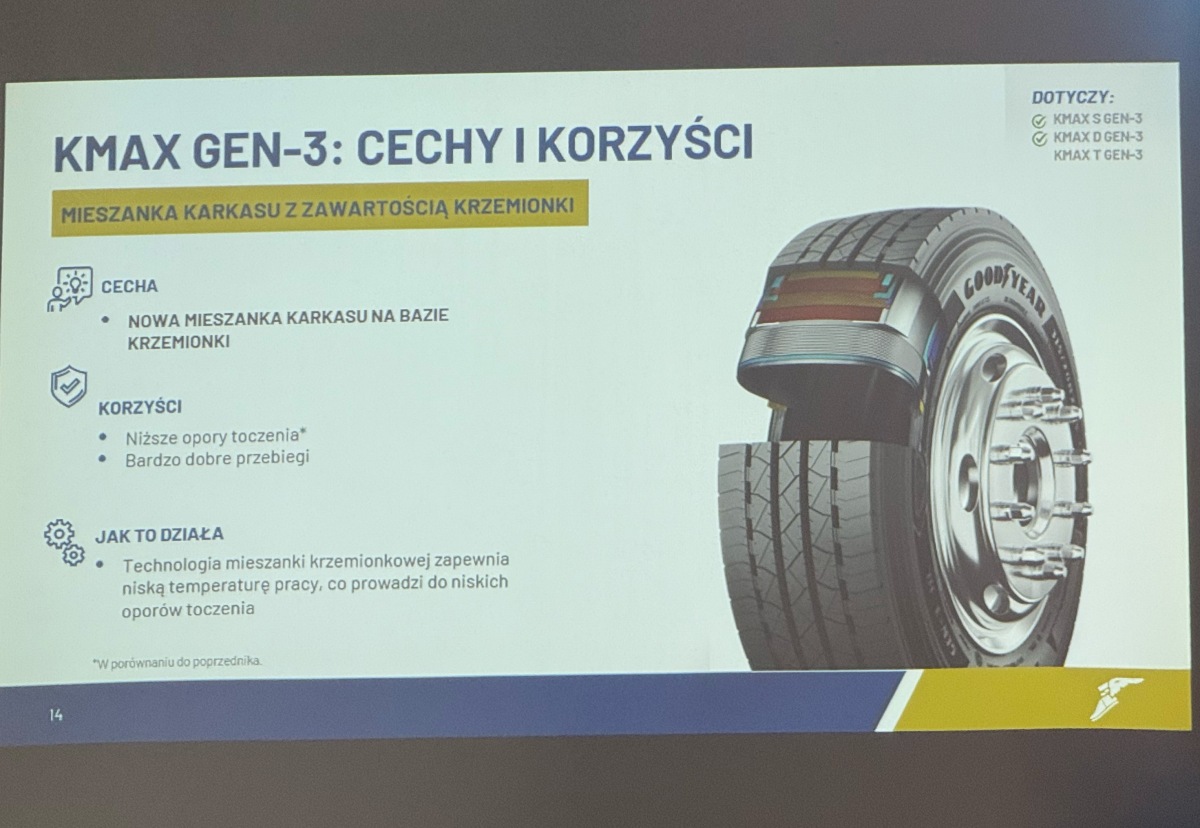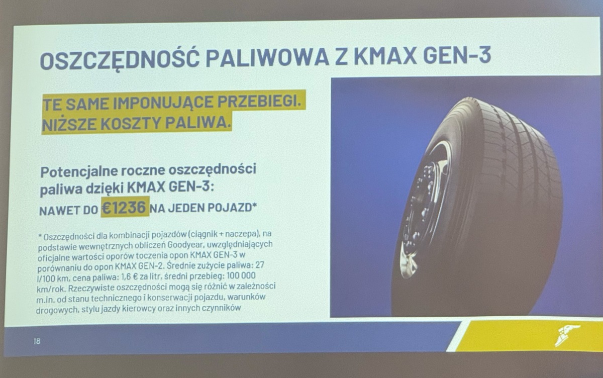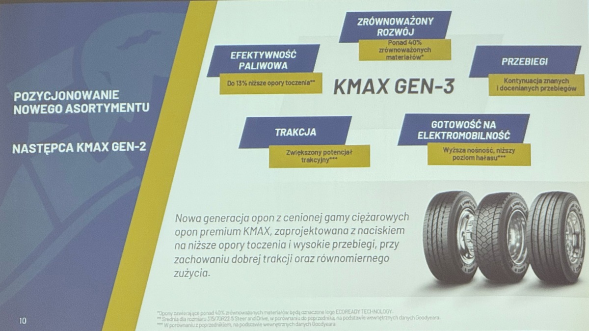 KMax Gen-3 miał być odpowiedzią branży oponiarskiej na potrzebę obniżenia całkowitego kosztu posiadania. Wyposażenie floty pojazdów w ten model ma przynieść widoczne oszczędności w skali roku. Nowa mieszanka jest stworzona także z myślą o elektrycznych ciężarówkach, które ważą znacznie więcej: sam akumulator takiego pojazdu to od 3 do 4 ton. Gen-3 ma mieć zwiększoną nośność i sztywność bieżnika, dzięki czemu zdecydowanie lepiej sobie radzi z dodatkową masą i wyższym, dostępnym od samego dołu momentem obrotowym. Z kolei zmniejszone opory toczenia mają pozytywnie wpłynąć na zasięg ciężarówki ładowanej „z wtyczki”.