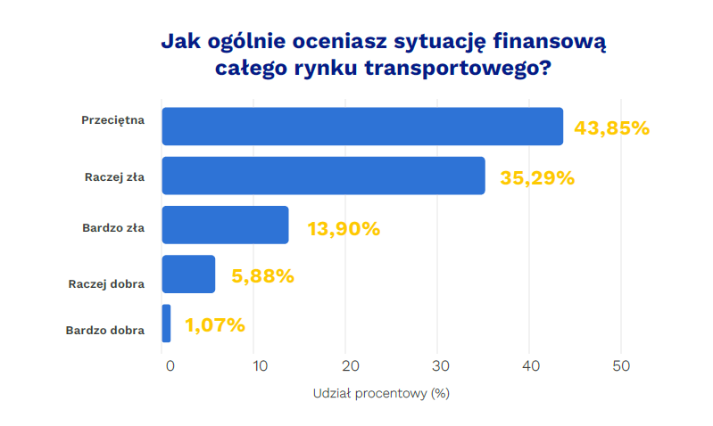 Ponad 80% ankietowanych firm z sektora TSL odczuło wzrost kosztów działalności od początku 2025 roku, z czego aż 60% odnotowało wzrost o więcej niż 10%. Głównymi czynnikami wpływającymi na płynność finansową przewoźników są zatory płatnicze i długie terminy płatności (63,1% wskazań), niskie stawki za fracht (50,3%) oraz wzrost kosztów operacyjnych (42,3%). Milena Kalinowska z Transcash.eu tłumaczy, że przewoźnicy, choć ocenili swoją płynność finansową na 3,6 punktu, nie mają większych problemów z opłacaniem zobowiązań, oceniając tę wartość na 4,7 punktu. Natomiast spedytorzy ocenili własną płynność na 4,3 punktu, a rentowność na 3 punkty.