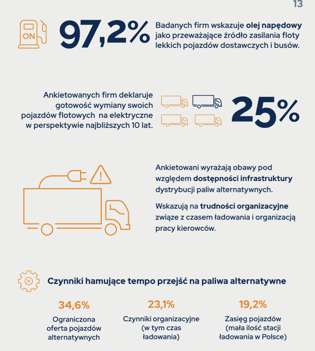 Pod względem rodzaju napędu olej napędowy wciąż pozostaje fundamentem tego segmentu, zasilając 97,2% aktualnie użytkowanych flot. Widać jednak znacznie większą niż w innych sektorach otwartość na zmiany, ponieważ co czwarta firma deklaruje gotowość do przejścia na pojazdy elektryczne w perspektywie najbliższej dekady.